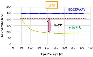 為了防止出現這種閃爍現象,需要有能夠確保保持電流恒定的泄放電路,各制造廠商采用各種各樣的方式構成泄放電路。BD555AKFV內置有羅姆獨創的泄放電路,采取了避免無謂損失的措施。