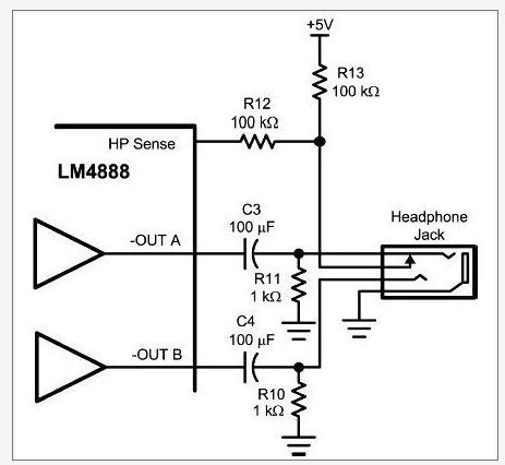 圖1:典型的立體聲聲頻子系統(tǒng)應用線路(以美國國家半導體LM4888為例)