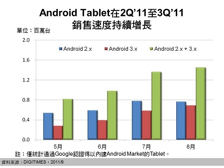 DIGITIMES Research分析師兼項(xiàng)目經(jīng)理林俊吉根據(jù)Google每月公開的連上Android Market 裝置規(guī)格分布比例信息后估算,通過Google認(rèn)證的Android Tablet月銷售量應(yīng)已從2011年第二季的不及百萬臺(tái),在8月份邁入近150萬臺(tái)的水平。