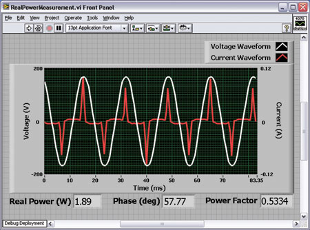 功率損耗的更精確描述可以通過測量設備的真實功率,或“近似功率”獲得,這種測量必須考慮信號的波形和相位。分析真實功率的方法之一是使用兩臺同步的PXI-4071 FlexDMM設備,每臺都具有采集電壓和電流波形速率高達1.8Ms/s的能力,并提供標準DMM的讀數(shù)方式。