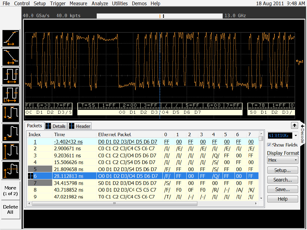 迄今為止,業(yè)界僅針對(duì) I2C、SPI、CAN 等總線或基于 8b/10b 的解碼方案提供以示波器為基礎(chǔ)的協(xié)議解決方案,而 64b/66b 開(kāi)發(fā)人員只能對(duì)這一復(fù)雜設(shè)計(jì)進(jìn)行手動(dòng)解碼。Agilent N8815A 以太網(wǎng) 10Gbase-KR 解碼應(yīng)用軟件可以實(shí)時(shí)執(zhí)行解碼程序,使開(kāi)發(fā)團(tuán)隊(duì)能夠更快地推出優(yōu)質(zhì)產(chǎn)品。