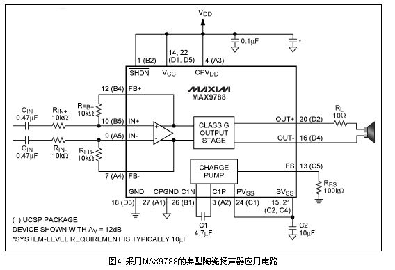 圖4中的MAX9788采用一個片上電荷泵產(chǎn)生與VDD相反的負(fù)電源電壓。當(dāng)輸出信號需要高壓驅(qū)動時,負(fù)電源電壓作用于輸出級。MAX9788提供了一種驅(qū)動陶瓷揚(yáng)聲器的優(yōu)化方案,比采用AB類放大器和升壓轉(zhuǎn)換器的傳統(tǒng)方案更高效。