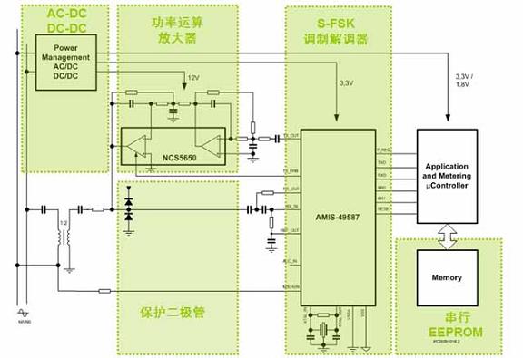 AMIS-49587符合IEC61334-5-1標準,為客戶提供眾多應用優(yōu)勢。例如,這器件基于ARM7TDMI處理器內(nèi)核,同時包含物理接口收發(fā)器 (PHY)和媒體訪問控制器(MAC)層,使其以單芯片方案結(jié)合了模擬調(diào)制解調(diào)器前端和數(shù)字后處理功能,而大多數(shù)競爭方案需要復雜的嵌入式軟件來執(zhí)行與 AMIS-49587相同的功能。設計人員使用AMIS-49587調(diào)制解調(diào)器,可以簡化設計,能在不到一個季度的時間內(nèi)開發(fā)出全套互操作PLC方案,還 降低開發(fā)及應用成本。實際上,基于AMIS-49587的調(diào)制解調(diào)器方案中僅使用2顆IC(另一顆為NCS5650 2 A PLC線路驅(qū)動器),外加16顆電阻、17顆電容、2個二極管、1個晶體和1個脈沖變壓器,總元件數(shù)量僅為39個,提供低物料單(BOM)成本。