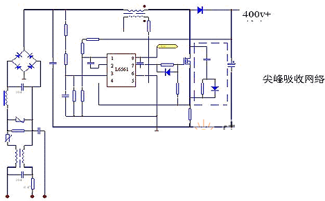 3.在低電壓時,MOS 的升壓電流更大(PWM 輸出導(dǎo)通較寬)MOS 溫升較高。這時可將電壓范圍設(shè)定為接近值,例如:120v~260v 時同等負(fù)載測試時,可將電感的感量及匝數(shù),按照260v 時的輸入值,設(shè)定并最大可能減少次級匝數(shù)。在120v 時可將輸入最低電壓設(shè)定為110v最大限度增加電感感量,使母線在110v 滿載時輸出達(dá)到額定的400v。在260v 時設(shè)定次級是由于輸入電壓升高,輸入電流減小會使次級電壓下降,5 腳電流采樣失效,使芯片進(jìn)入重新啟動(誤以為空載)母線不斷脈動的重新啟動。110V 調(diào)試時感量大,可減少因輸入電壓低而導(dǎo)致的PWM 頻率太高,帶來的MOS 開關(guān)損耗,感量大時亦可有效減少峰值電流的值。另一減少MOS 溫升的方式是并聯(lián)一路吸收網(wǎng)絡(luò)。電阻并聯(lián)高速二極管后在串聯(lián)一只電容可使MOS 開關(guān)時的尖峰反向電壓得到有效吸收。(小功率無明顯優(yōu)勢)。