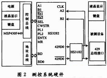 接口的實現(xiàn)方式選用Intersil公司的HS3282芯片,它支持ARINC429通信規(guī)范和其他串行數(shù)據(jù)傳輸協(xié)議,采用+5 V供電。具有兩路接收、一路發(fā)送的功能。通道接收器之間也是獨立的并行接收,可以直接連接到ARINC429總線,而不需電平轉(zhuǎn)換。使用時和HS3182總線驅(qū)動器配合,就可以發(fā)送數(shù)據(jù)進(jìn)行二級差分驅(qū)動,產(chǎn)生ARINC429總線的電平。HS3282數(shù)據(jù)總線為16位,MSP430F449為16位單片機(jī),從而避免了8位單片機(jī)為解決系統(tǒng)總線匹配的問題需要采用鎖存器作為虛擬總線的煩惱,提高了測控系統(tǒng)的可靠性。