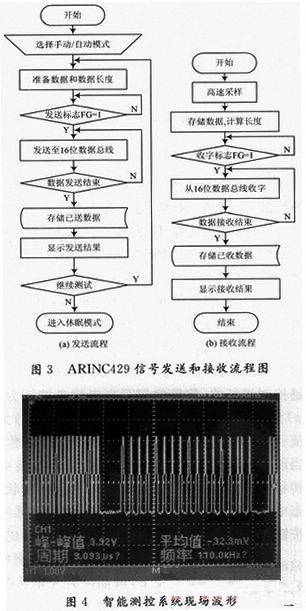對此便攜式低功耗雷達(dá)導(dǎo)航儀智能測控系統(tǒng)的測試內(nèi)容包括:發(fā)送數(shù)據(jù)、接收數(shù)據(jù)和發(fā)送數(shù)據(jù)間隔等測試。由于HS3282的兩路輸出是差分輸出的,所以只需要測試其中的一路就可以了。智能測控系統(tǒng)現(xiàn)場波形如圖4所示,發(fā)送的數(shù)據(jù)采用自動模式,控制字為奇校驗。通過示波器直接觀察HS3282芯片的輸出信號,輸出電平是3.92 V,滿足TTL的電平要求。而數(shù)據(jù)之間的時間間隔,即組間數(shù)據(jù)4位間隔。由單片機(jī)的延時程序即可完成。
