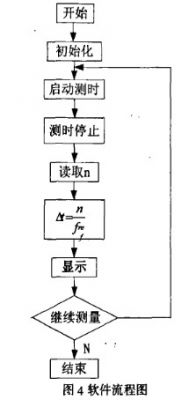 系統軟件包括對各工作電路的初始化設置,根據分頻計數電路得到的n值,計算時間間隔時間間隔Δt,送給顯示電路顯示。流程圖如圖4所示。