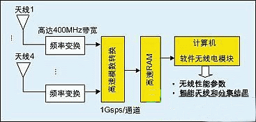 VIPER被設(shè)計成在最少的RF硬件條件下,在軟件中實現(xiàn)處理功能。圖4給出了接收器硬件的模塊示意圖。執(zhí)行單階下變頻后,在四個信道的每一個信道的IF信號以每秒1G的采樣率被采樣。所采集樣本信號存儲在RAM中,并由計算機處理。