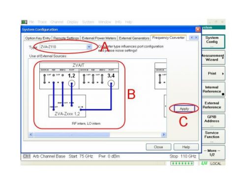 在圖2所示的A、B、C三個區(qū)域進行如下測量配置:在A區(qū)擇變頻模塊型號,在B區(qū)選擇電纜連接方式,在C區(qū)點擊應(yīng)用按鍵并連接變頻模塊到網(wǎng)絡(luò)分析儀(見圖 3),然后將頻率軸調(diào)節(jié)成75GHz到110GHz(見圖2底部)此外,變頻模塊的所有測量參數(shù)會被自動設(shè)置(例如射頻和本振的倍頻系數(shù)、最佳功率電平、復位設(shè)置、連接類型WR10,以及定義和選擇波導校準套件R&S ZV-WR10)