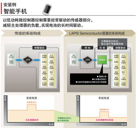 羅姆集團旗下的LAPIS Semiconductor面向智能手機市場開發(fā)出了可用更低耗電量綜合控制各種傳感器的、世界最小級別的低功耗微控制器“ML610Q792”。最近,在手機中智能手機所占的比率日益增加,而為了提供新的應(yīng)用和服務(wù)不斷增加的傳感器群,導(dǎo)致智能手機的電池負載持續(xù)上升。LAPIS Semiconductor著眼于這種情況,將需要頻繁驅(qū)動的傳感器群從主處理器分離,通過低功耗微控制器進行控制,減輕了主處理器的負載,從而實現(xiàn)了電池的長時間驅(qū)動。另外,利用本微控制器的特點——即耗電量低的特性,通過與無線通信的組合,亦適用于傳感器網(wǎng)絡(luò)模塊等應(yīng)用。