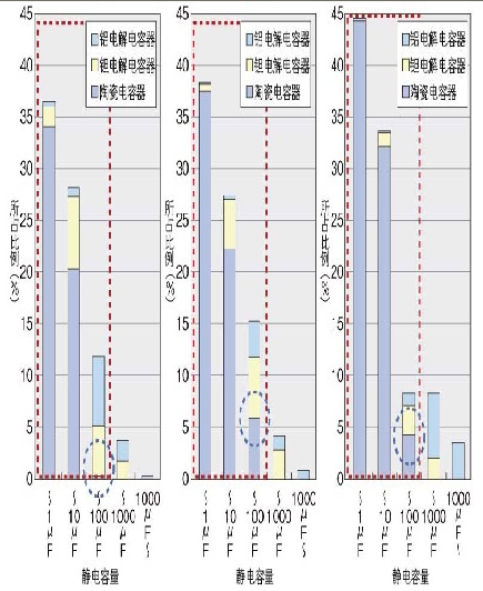圖2:大容量產品的所占比例按照不同的靜電容量對電容器的總需求進行了統計,分別明確了片狀獨石陶瓷電容器、鋁電解電容器、鉭電解電容器各自所占比例?!?/p>