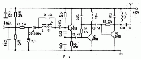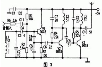 圖4為晶振式發射機電路。電路中J.、VD1、L1、C3~C5、V1組成晶體振蕩電路。由于石英晶體J的頻率穩定性好,受溫度影響也較小,所以廣泛用于無繩電話及AV調制器中。Vl是29~36MHz晶體振蕩三極管,發射極輸出含有豐富的諧波成分,經V2放大后,在集電極由C7、L2構成諧振于88-108MHz的網絡選出3倍頻信號(即87~108MHz的信號最強),再經V3放大;L3、C9選頻后得到較理想的調頻頻段信號。頻率調制的過程是這樣的,音頻電壓的變化引起VD1極間電容的變化;由于VD1與晶體J串聯,晶體的振藩頻率也發生微小的變化,經三倍頻后,頻偏是29-36MHz晶體頻偏的3倍。實際應用時,為獲得合適的調制度,可選擇調制頻偏較大的石英晶體或陶瓷振子,也可以采用電路稍復雜的6-12倍頻電路。若輸入的音頻信號較弱;可加上一級電壓放大電路。