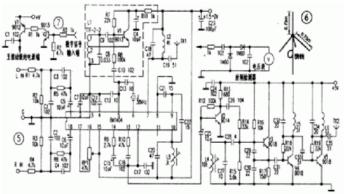 很多調頻立體聲模塊均將BAl404和外圍元件封裝在一個塑料或金屬外殼內制成,只露出電源輸入、音頻輸入、射頻輸出引線,只要了解BAl404以后,就知道調頻立體聲模塊內部是怎么一回事了。來自音源的立體聲音頻信號經R1、R2、R5、C1、C3、C5(R4、R3、R6、C2、C4、C6)組成的網絡耦合到BAl404。經IC內部左(右)聲道放大,再進行平衡調制,調制后的復合信號從IC的第14腳輸出,后與第13腳上的導頻信號通過B9、C15,B10、C16、C17構成的網絡進行混頻,混頻后的復合信號進入IC的12腳,對比的⑧、⑨、⑩腳,C20--C22及髓組成的電容三點式振蕩器進行調頻,IC的⑩腳上已調制的射頻信號經內部放大后從第⑦腳輸出,經C18、L2選頻后送至天線TXl。要實現調頻立體聲,BAl404的⑤、⑥腳需外接38kHz晶體,但業余制作時的確很難購得38kHz的專用晶體,所以在無該晶體的情況下,可以參考虛線內的電路,用分立元件制作一個38kHz振蕩器,該38kHz信號經過R8、C10送人IC第⑤腳。制作時,Ll可用收音機中頻變壓器ITF—2—1、TTF-2-2或TFF-2-9等,同時注意引腳的連接不要搞錯,③腳接地,②腳接V1的發射極,①腳為反饋和輸出腳。通過調整其磁芯可以獲得頻率較穩定、幅度足夠高的38kHz信號。