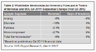 據IHS iSuppli公司的庫存研究報告,對于半導體的需求下降,在2011年第四季度加劇了半導體產業庫存過剩局面,并帶來一系列令人不快的變化,但在看到新的樂觀跡象之后,半導體廠商急于忘掉不快,希望這是低迷階段的尾聲。