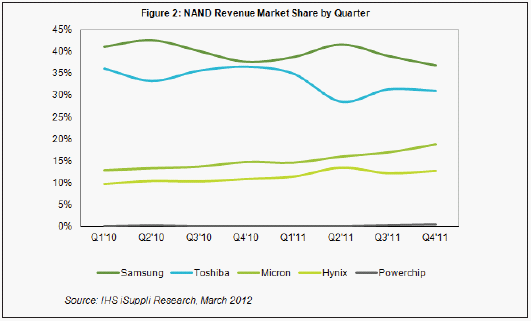 在材料方面,晶圓供應商在一個月后就快速恢復了生產,并提高了其它地點的產量,使其主要客戶面臨的供應短缺問題降低最小。中期來看,這場災害實際上導致NAND市場更加接近供需平衡,幫助該產業的營業收入在2011年第三季度環比增長10.0%,而2010年第三季度是環比增長9.1%。