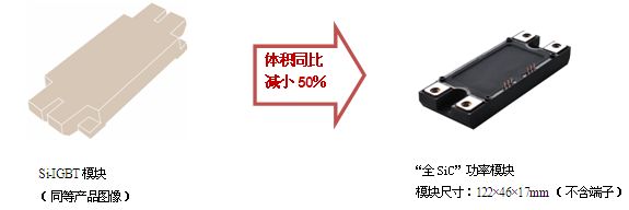 不僅如此,通過設(shè)計和工藝的改善,羅姆還成功開發(fā)出散熱性卓越的模塊。替換傳統(tǒng)的400A級別的Si-IGBT模塊時,體積可減小約50%。由于損耗低,因此發(fā)熱少,可減小外置的冷卻裝置體積,從而非常有助于設(shè)備整體的小型化。