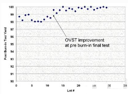 校正措施通常包括:從晶圓制造工藝技術(shù)本身減少缺陷,改進(jìn)自動(dòng)測試設(shè)備應(yīng)力測試以提高故障檢測機(jī)制效率,在工藝上游實(shí)施改進(jìn)的異常值控制以將超負(fù)載試驗(yàn)的結(jié)果提高至100%良率。圖2顯示了根據(jù)逐步量產(chǎn)階段了解到的情況實(shí)施測試增強(qiáng)以后得到的改進(jìn)的超負(fù)載測試良率。
