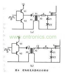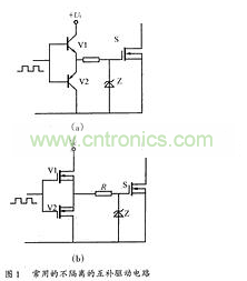 圖1(a)為常用的小功率驅動電路,簡單可靠成本低。適用于不要求隔離的小功率開關設備。圖1(b)所示驅動電路開關速度很快,驅動能力強,為防止倆個MOSFET管直通,通常串接一個0.5~1Ω小電阻用于限流,該電路適用于不要求隔離的中功率開關設備。這兩種電路結構特簡單。