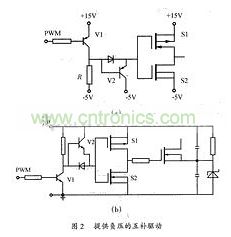功率MOSFET屬于電壓型控制器件,只要柵極和源極之間施加的電壓超過其閾值電壓就會導通。由于MOSFET存在結電容,關斷時其漏源兩端電壓的突然上升將會通過結電容在柵源兩端產生干擾電壓。常用的互補驅動電路的關斷回路阻抗小,關斷速度較快,但它不能提供負壓,故其抗干擾性較差。為了提高電路的抗干擾性,可在此種驅動電路的基礎上增加一級由V1、V2、R組成的電路,產生一個負壓,電路原理圖如圖2(a)所示。