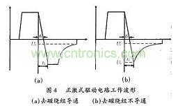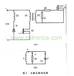 電路原理圖如圖3(a)所示,N3為去磁繞組,S2為所驅動的功率管。R2為防止功率管柵極、源極端電壓振蕩的一個阻尼電阻。因變壓器漏感較小,且從速度方面考慮,一般R2較小,故在分析中忽略不計。其工作波形分為兩種情況,一種為去磁繞組導通的情況,見圖4(a);一種為去磁繞組不導通的情況,見圖4(b)。