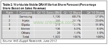 移動市場第一季度占總體DRAM營業收入的28.0%。第一季度mDRAM平均銷售價格(ASP)為1.72美元每GB,仍然高于商品類DRAM,后者價格是0.52美元每GB。但是,由于商品類DRAM價格預計下半年上漲,而mDRAM價格總體下降,所以目前移動DRAM所擁有的價格升水今年將逐漸縮小。與此同時,2012年移動DRAM營業收入將繼續增長,其比特出貨量預計下半年勁增20%以上。