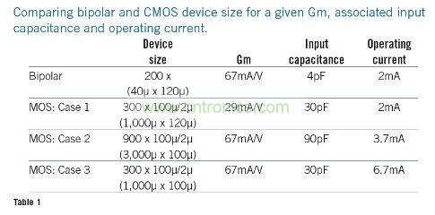 表1是用于放大器的雙極性器件和CMOS器件的尺寸比較。CMOS器件較大的尺寸及伴隨的輸入電容嚴重限制了放大器的輸入帶寬。在本例中,采用雙極性放大器可實現低偏置電流下的低噪聲。但使用雙極性器件可能會有基電流噪聲,而這在CMOS器件中則可以忽略不計。該基電流噪聲的幅度取決于傳感器的阻抗和系統具體的實施情況。
