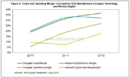 第一季度希捷的毛利率達到36.9%,高于去年第四季度時的31.6%,以及去年第三季度時的19.3%。泰國洪災發生在去年第三季度。希捷的營業利潤率上升幅度更大,從去年第四季度的18.9%跳增至27.2%,如圖1所示。