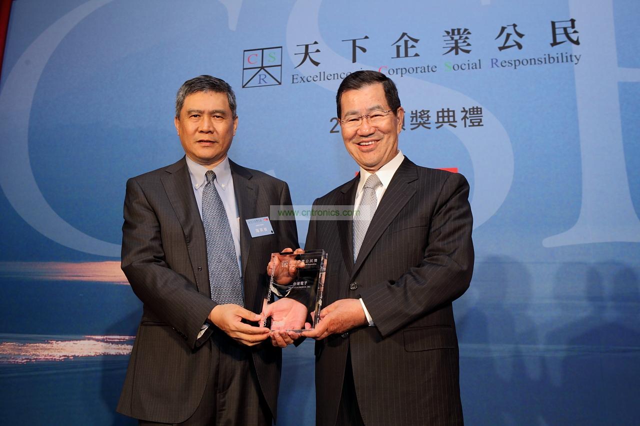 臺(tái)達(dá)電子海英俊董事長(zhǎng)(左)出席2012 天下雜誌企業(yè)公民獎(jiǎng)?lì)C獎(jiǎng)典禮, 自 蕭萬(wàn)長(zhǎng)前副總統(tǒng)手中接過(guò)大型企業(yè) 首獎(jiǎng)