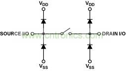 信號源、漏極和邏輯控制端對正負源電壓都設(shè)計有箝位二極管以提供ESD保護,如圖1所示。在正常工作模式下,這些二極管反向偏置,因此除非信號超過電源電壓,否則不會通過電流。這些二極管的尺寸因工藝而異,不過一般都采用小型設(shè)計,以盡量減少正常工作時的漏電流。