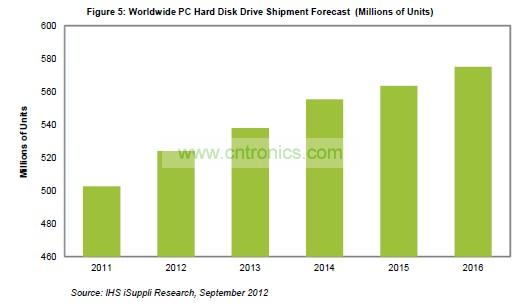 預(yù)計2012年總體PC市場的硬盤出貨量將達到5.24億個,比去年的5.025億個增長4.3%。2012年出貨量將創(chuàng)下硬盤產(chǎn)業(yè)的最高紀(jì)錄,但好景不長。實際上,預(yù)計硬盤出貨量將持續(xù)爬升,每年出貨量都將更上層樓,至少直到2016年。預(yù)計2016年出貨量將達到5.751億個,如圖所示。