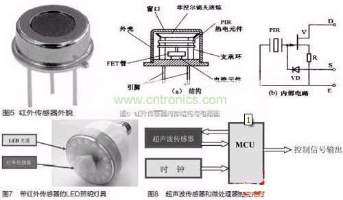 被動式紅外傳感器有三個關鍵性的元件:菲涅爾濾光透鏡,熱釋電紅外傳感器和匹配低噪放大器。菲涅爾透鏡有兩個作用:一是聚焦作用,即將熱釋紅外信號折射在PIR上:二是將探測區內分為若干個明區和暗區,使進入探測區的移動物體/人能以溫度變化的形式在PIR上產生變化的熱釋紅外信號。一般還會匹配低噪放大器,當探測器上的環境溫度上升,尤其是接近人體正常體溫(37℃)時,傳感器的靈敏度下降,經由它對增益進行補償,增加其靈敏度。輸出信號可用來驅動電子開關,實現LED照明電路的開關控制。圖5是紅外傳感器外貌,圖6是紅外傳感器內部結構與內部電路圖。圖7是帶紅外傳感器的LED照明燈具,這是一款E27標準螺口燈頭的燈具,其電源適用范圍是AC180V-250V(50/60Hz),紅外傳感器檢測范圍大約在3m~15m,其標準產品IFS-Bulb3W燈具達80lm,5W燈具達140lm.在LED光源模塊的中央部分嵌入紅外線傳感器。一旦紅外傳感器檢測到人的體溫,LED電燈泡將會在50s內自動開啟與關閉。適用于任何一種室內應用,如走廊、儲藏室、樓梯和大廳入口處。