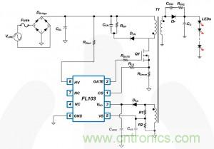 低功率照明包 括蠟燭、照明球燈泡和 20W 以下的白熾燈。 這些是小燈泡,主要用于住宅和零售場所。 尺寸和成本是兩個最大的關注點,所以使用初級端調節 (PSR) 拓撲是一個很好的選擇。 一個 PSR 控制器僅使用 LED 燈控制器初級端的信息來精確控制輸出電壓和電流。 消除了輸出電流檢測損耗并取消了次級反饋電路。 結果是設計用更少外部元件,滿足更緊密的恒定輸出電流要求。 一個 20W 的 LED 負載,以 80% 的功率啟動,熱損失約 4W。 圖 1 是一個使用 FL103 的電路樣本,飛兆 FPS™ 功率開關器件,是一個帶 PSR 功能的控制器。