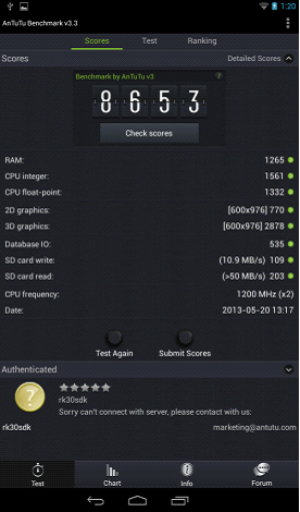 同樣是雙核產(chǎn)品,RK3168在整體性能發(fā)揮上得到了兩倍于A20的分?jǐn)?shù),不難看出RK3168在這項(xiàng)對比上具有壓倒性的優(yōu)勢。A20受限CortexA7的發(fā)揮,在內(nèi)存和CPU浮點(diǎn)性能等方面表現(xiàn)較差,整體性能只能達(dá)到單核A9的水平。