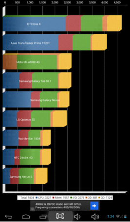具有600MHz主頻SGX PVR540 GPU的RK3168在此項(xiàng)測試上遠(yuǎn)遠(yuǎn)拋離A20的Mail 400 @350Mhz,充分體現(xiàn)了兩者在GPU性能上的巨大差距。目前GPU性能對于平板來說是僅次于CPU的重要指標(biāo),很大程度上決定了整機(jī)在運(yùn)行大型游戲、播放在線視頻等方面的體驗(yàn),對消費(fèi)者來說是非常重要的考慮因素。
