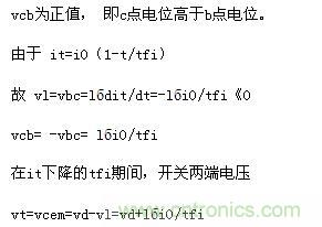 因此,在關斷過程一開始,vt立即從零上升到vcem,it在從i0下降至零期間,vt=vcem不變。直到it=0、id=i0以后,vt才下降為電源電壓vd,如圖5(b)所示。vcem超過vd的數值取決于lб、tfi和負載電流i0,顯然過快的電流下降率di/dt(即tfi小)、過大的雜散電感lб或負載電流過大都會引起關斷時元件嚴重過電壓,且伴隨著很大的功耗。