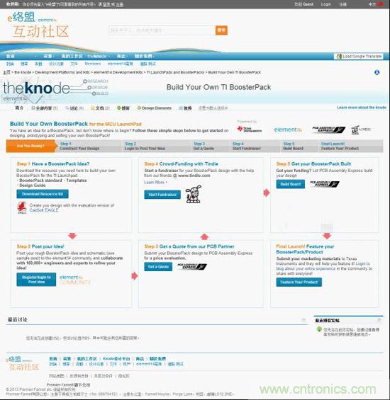 e絡(luò)盟母公司Premier Farnell集團首席技術(shù)官沈洪先生表示:“我們很高興能夠在強大的e絡(luò)盟社區(qū)推出這個行業(yè)首屈一指的網(wǎng)站平臺。e絡(luò)盟社區(qū)現(xiàn)擁有20萬社區(qū)成員,通過將設(shè)計工程師、業(yè)余愛好者及供應商合作伙伴集中到一個平臺,以便他們進行直接交流,極大地縮短了新品上市時間。我們極力鼓勵并支持用戶開發(fā)針對TI MCU LaunchPad的擴展板。我們將幫助他們進行概念設(shè)計、產(chǎn)品開發(fā)、原型設(shè)計,直至最后投入市場。”
