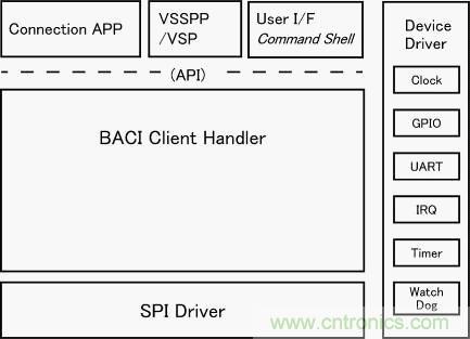 BACI通過(guò)簡(jiǎn)化與主機(jī)之間的通信來(lái)降低訪問頻率。而且,在結(jié)構(gòu)設(shè)計(jì)上采用通過(guò)事件使主機(jī)啟動(dòng)的結(jié)構(gòu),因此,是盡可能使主機(jī)停動(dòng)來(lái)抑制耗電量的設(shè)計(jì)。綜上所述,本LSI在整個(gè)結(jié)構(gòu)模塊上進(jìn)行了降低耗電量的設(shè)計(jì),從而,使紐扣電池驅(qū)動(dòng)3年以上連續(xù)工作成為可能。主機(jī)和堆棧結(jié)構(gòu)如圖2所示。
