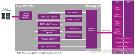 V2500 內核加入 Imagination 現有的 PowerVR 多媒體內核系列后,與新的 PowerVR Series6XT圖形處理器和 PowerVR Series5 視頻與靜態圖像編解碼器一起,形成了一個完整、整合的視覺平臺,能為今天的相機應用顯著節省電源與帶寬,并為臉部和姿勢識別、增強現實等下一代內容感知應用奠定基礎。