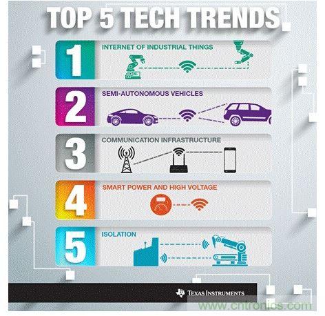 在迎接2015到來之際,我們有必要花時間來評估和預(yù)測未來的一年中將會出現(xiàn)的技術(shù)挑戰(zhàn)和突破創(chuàng)新。通過與眾多戰(zhàn)略客戶、大學(xué)合作伙伴以及TI產(chǎn)品線的技術(shù)專家進行探討后,我們認為TI將在一些重要技術(shù)趨勢中發(fā)揮戰(zhàn)略性作用。這些技術(shù)趨勢正推動著汽車和工業(yè)等多個市場的發(fā)展,而在此過程中,TI的工程師將幫助應(yīng)對半導(dǎo)體技術(shù)領(lǐng)域的獨特挑戰(zhàn),并利用先進技術(shù)改善我們的生活。