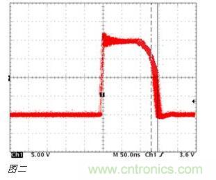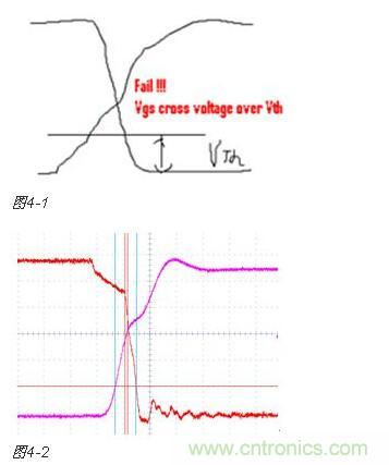 下面這種情況有非常多的人會忽視,甚至是一些比較有經(jīng)驗的電源測試工程師。下面組圖四是下管打開,上管關(guān)閉時候的波形(圖4-1是示意圖,圖4-2示實際測試圖)。雖然沒有被同時帶起的情況,但是請注意上下管有交叉的現(xiàn)象,而且交叉點的電平遠高于MOS管規(guī)定的Vth值,這是個嚴重的shoot through現(xiàn)象。最直接的后果就是MOS管燒毀!