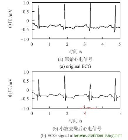 采用小波分析的方法進(jìn)行心電信號去噪。小波分析由于能同時在時域和頻域中對信號進(jìn)行分析,具有多分辨分析的功能,所以,在不同的分解層上有效地區(qū)分信號的突變部分和噪聲。對含有噪聲的原始心電信號進(jìn)行小波分解后,噪聲部分主要集中在高頻小波系數(shù)中,包含有用信號的小波系數(shù)幅值較大,但數(shù)目少;而噪聲對應(yīng)的小波系數(shù)幅值小,數(shù)目較多?;谏鲜鎏攸c(diǎn),選取無偏似然估計閾值對小波系數(shù)進(jìn)行處理,然后對信號重構(gòu)即可達(dá)到消噪的目的。圖7 為心電信號小波去噪前后對比,信噪比可以達(dá)到121 dB。