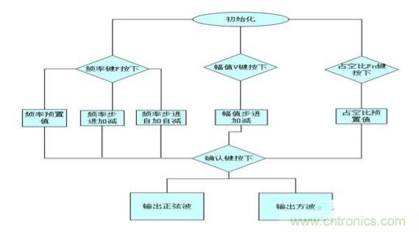 本系統(tǒng)要求在給定±15V電源電壓條件下設(shè)計出一個能產(chǎn)生正波和脈沖波的信號源。信號頻率為20Hz~20kHz,頻率能程控步進調(diào)整(步長為5Hz),脈沖波的占空比在2%~98%之間能程控步進調(diào)整(步長2%),兩路信號均要求幅值在100mv到3V步進可調(diào)(步長為100mv),要求性能良好(頻率穩(wěn)度高,非線性失真小等),方案考慮如下: