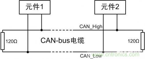 電信號在在電纜上傳輸時,當阻抗不連續或者發生突變時,就會發生信號反射。反射的過程十分的復雜,甚至可能發生多次反射,反射的信號疊加在正常的信號上,引起電平變化,導致數據傳輸出現錯誤。為了消減這種信號反射的方法,我們是使傳輸電纜上的阻抗保持連續,但是電纜總是有終點的,終點的阻抗是突變的,為了使終點阻抗保持連續,CAN-Bus規定要在電纜兩端接入匹配電阻。這個終端電阻的阻值一般選用120Ω。如圖 3所示。