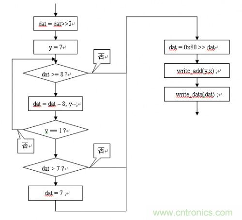 LCD的縱向分為8個地址從上到下依次為0~7,每個地址段有8個數據點。在某個數據段中如果想依次讓這些位從上到下點亮就需要依次向這個地址段送數據0x01,0x02,0x04,0x08,0x10,0x20,0x40,0x80,送入0x00后這個地址段的8個數據點將不被點亮。實現的具體過程如圖4所示。