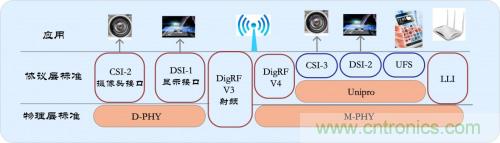 下圖2所示MIPI結(jié)構(gòu)分為物理層、協(xié)議層和應(yīng)用層。目前比較成熟的MIPI應(yīng)用有攝像頭CSI接口、顯示屏DSI接口和基帶和射頻間DigRF接口,而其他例如UFS、LLI等規(guī)范正在逐步制定和完善過程中。