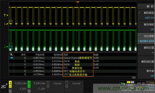 (1)現(xiàn)場模擬MIPI-DSI協(xié)議,使用數(shù)據(jù)挖掘型示波器ZDS4054 Plus,其免費(fèi)標(biāo)配MIPI-DSI協(xié)議低速LP模式解碼功能,具體操作如下圖7所示。