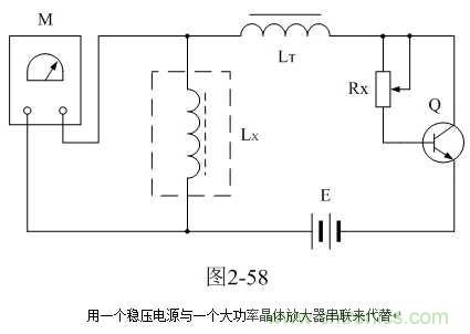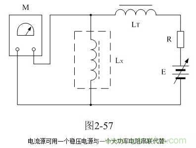 這里順便說明,采用圖2-54測試時應該注意的地方。圖2-54中,隔離電感LT的大小要求是測試電感Lx數值的3倍以上,并且測量高壓包初級線圈的初始電感值L0時,最好也要接入電路之中。這里,隔離電感LT可選取20毫亨以上的帶矽鋼片鐵芯的電感,電感的鐵芯要留有一定的氣隙;電流源可用一個穩壓電源與一個大功率電阻串聯代替,如圖2-57;或用一個穩壓電源與一個大功率晶體放大器串聯來代替,如圖2-58。