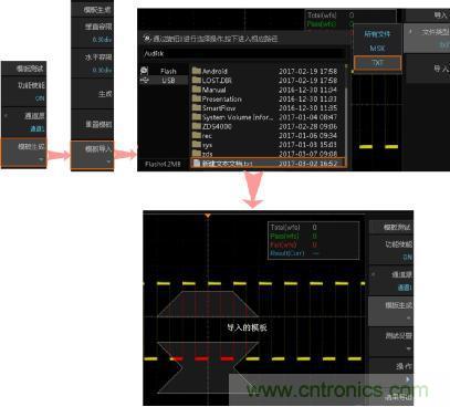 當(dāng)原始波形沒辦法滿足我們對波形的限制時,用戶還可將儀器內(nèi)部Flash存儲器或外部U盤中存儲的測試模板文件導(dǎo)入,導(dǎo)入的波形可以是以前保存的*.msk文件或者是自行設(shè)置的*.txt文件。