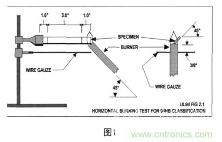 試樣水平放置,樣品的尺寸為125mm&TImes;13mm&TImes;厚度(大不能超過超過13mm),各自在距點燃端25mm和100mm做好標記,在距25mm標線遠端用試樣夾夾持住試樣,本生燈成45度角傾斜,不改變火焰的位置對試樣施加30s±1s的時間,對于該試驗的試樣材料又分成可自撐材料和非自撐材料兩種。