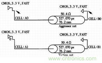 由于頻率的提高,傳輸線之間的串擾明顯增大,對信號完整性也有很大的影響,可以通過仿真來預測、模擬,并采取措施加以改善。以CMOS信號為例建立仿真模型,如圖6所示。在仿真時設置干擾信號的頻率為66MHz的方波,被干擾者設置為零電平輸入,通過調整兩根線的間距和兩線之間平行走線的長度來觀察被干擾者接收端的波形。仿真結果如圖7,分別為間距是203.2mm、406。4mm時的波形。